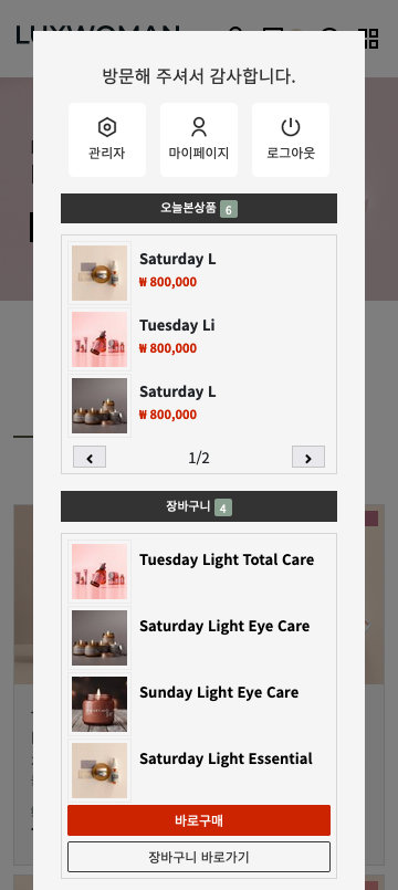 - · 로그인 후 사람 아이콘 클릭시 모달 창으로 오늘본상품, 장바구니, 위시리스트를 확인 할 수 있습니다.