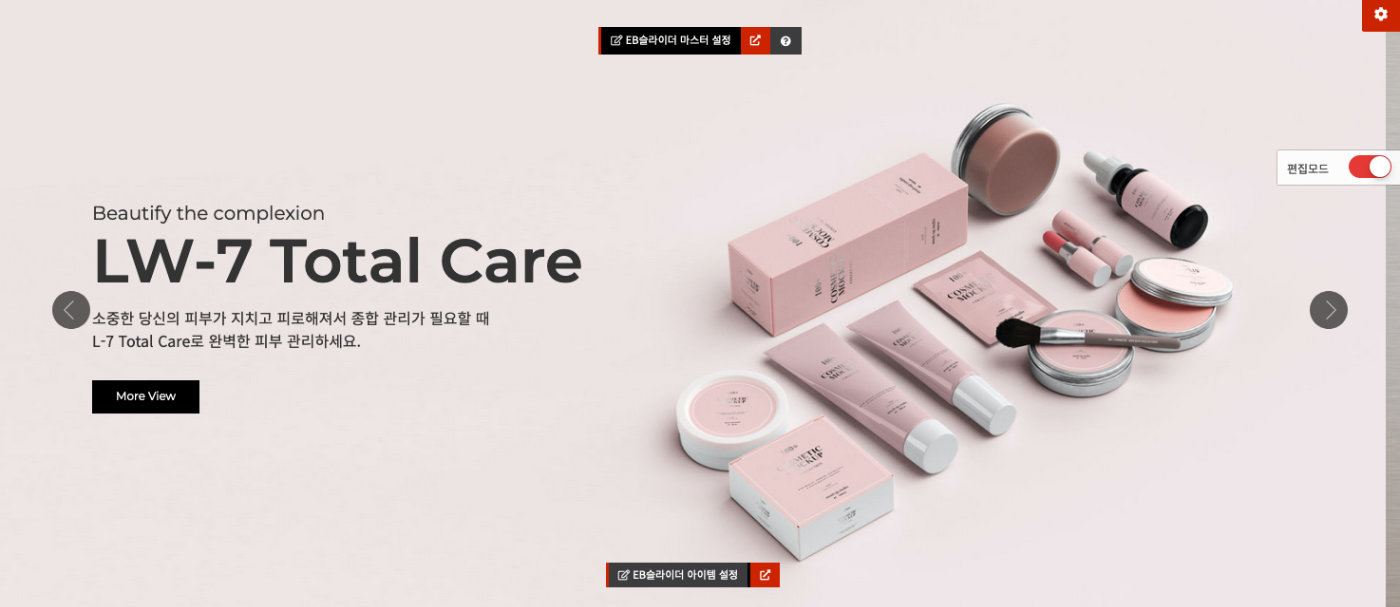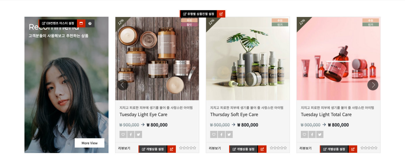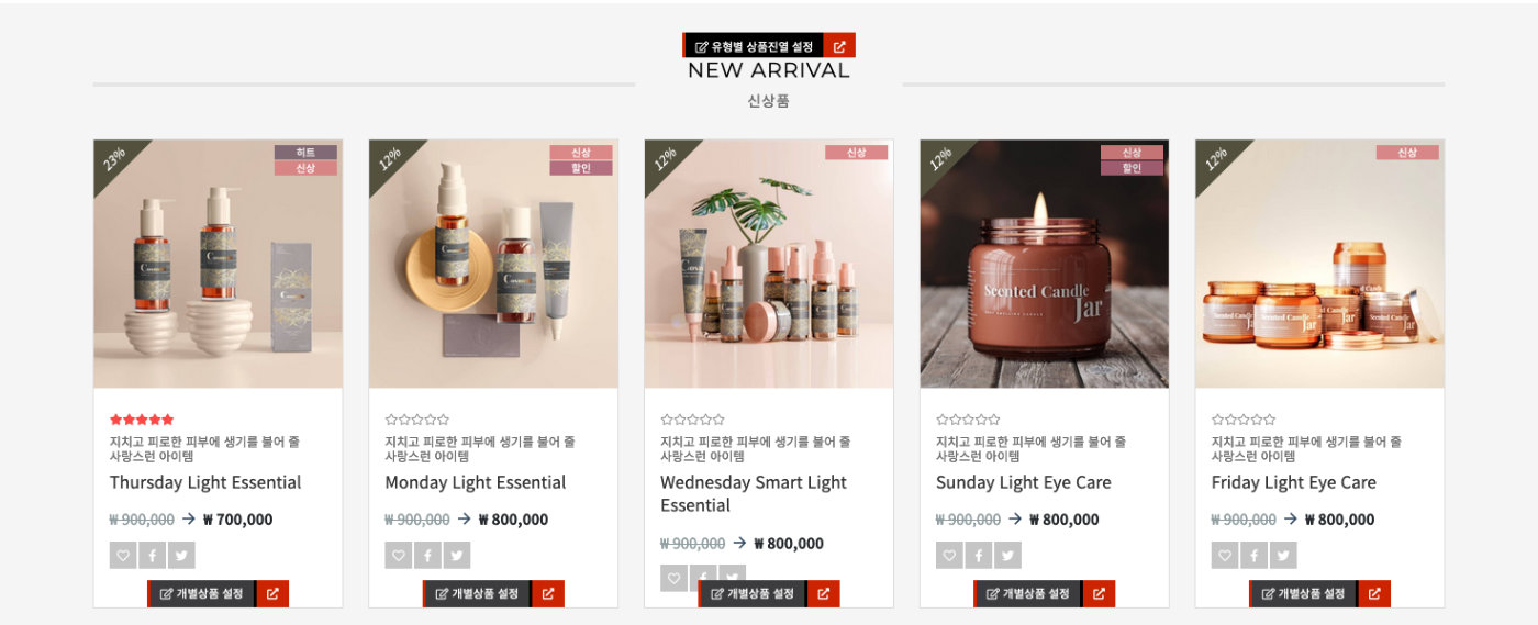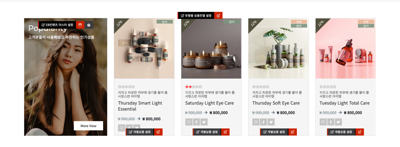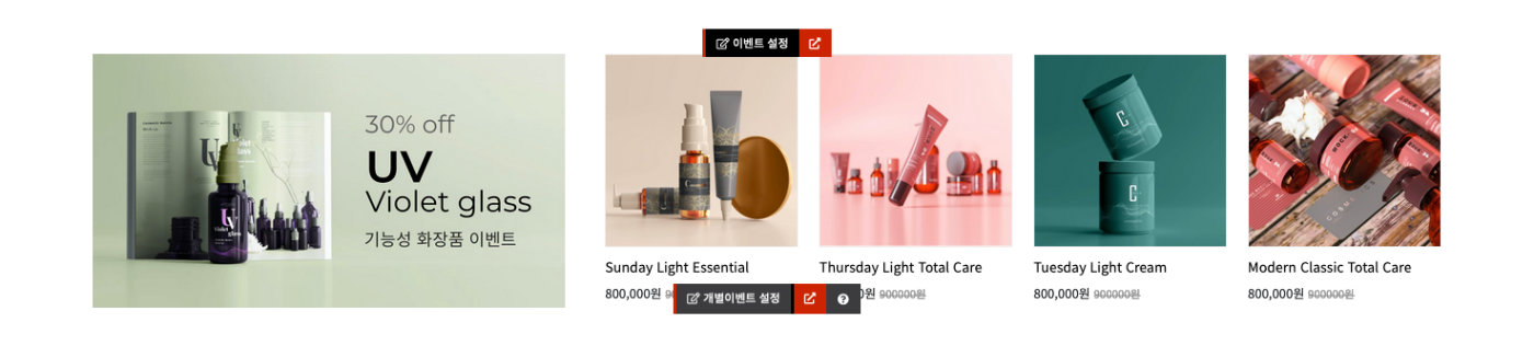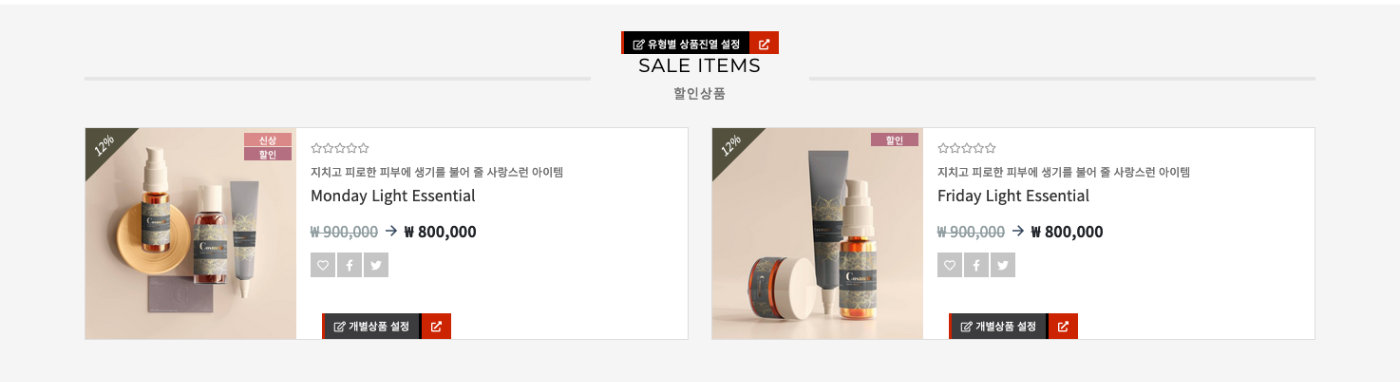 - 메인에서 편집모드를 통해 내용 및 이미지 수정이 가능하며 상품 등록 후에도 개별상품 설정이 가능합니다.