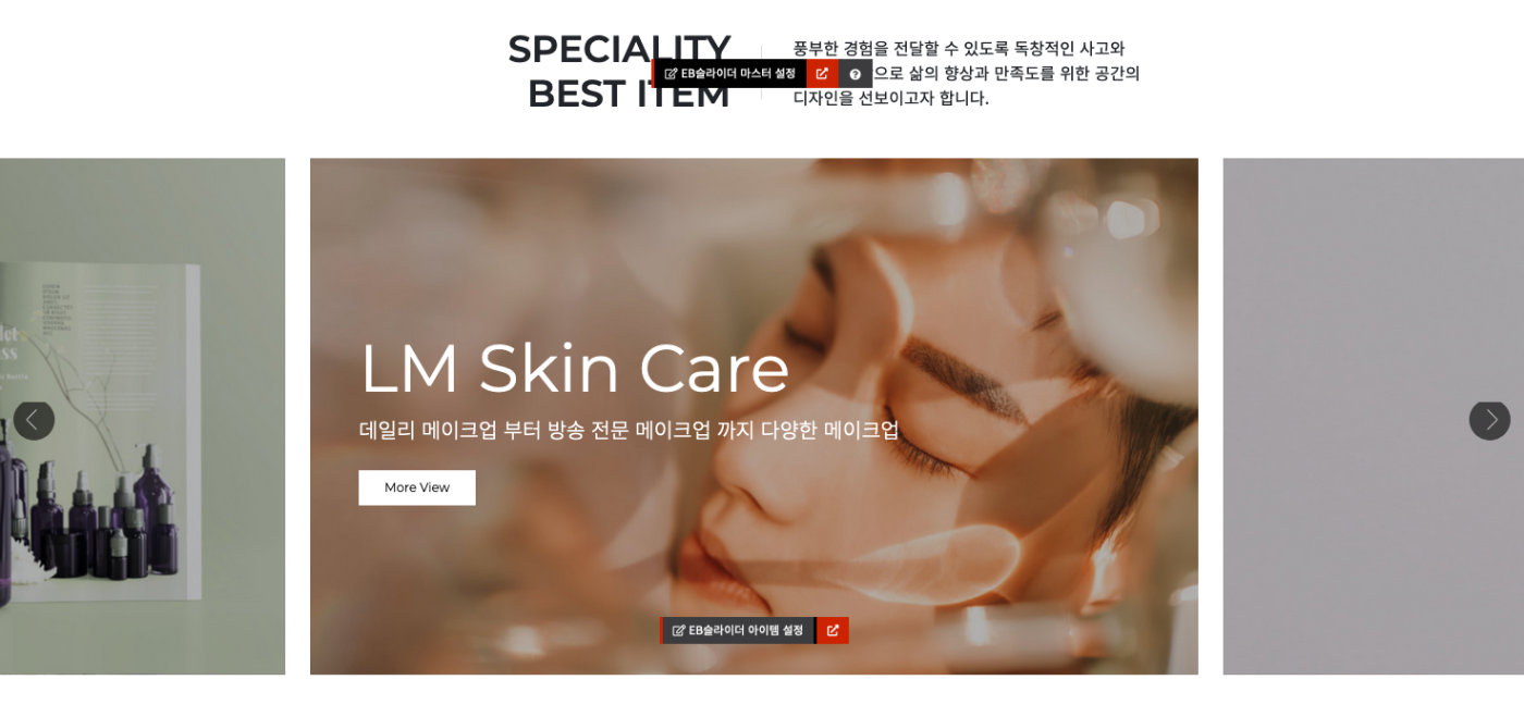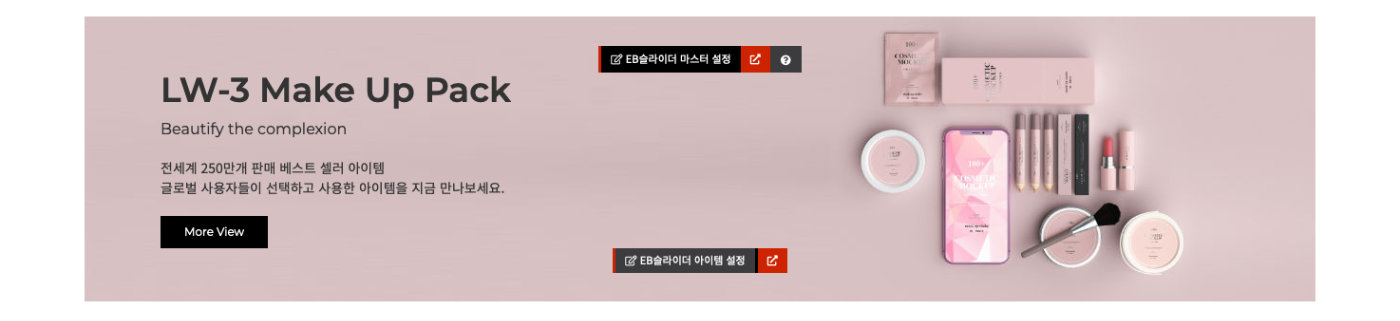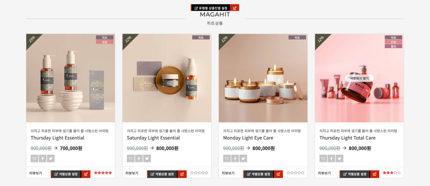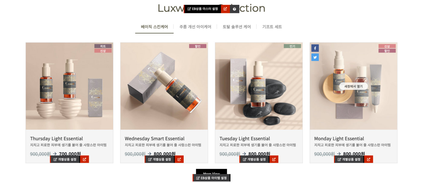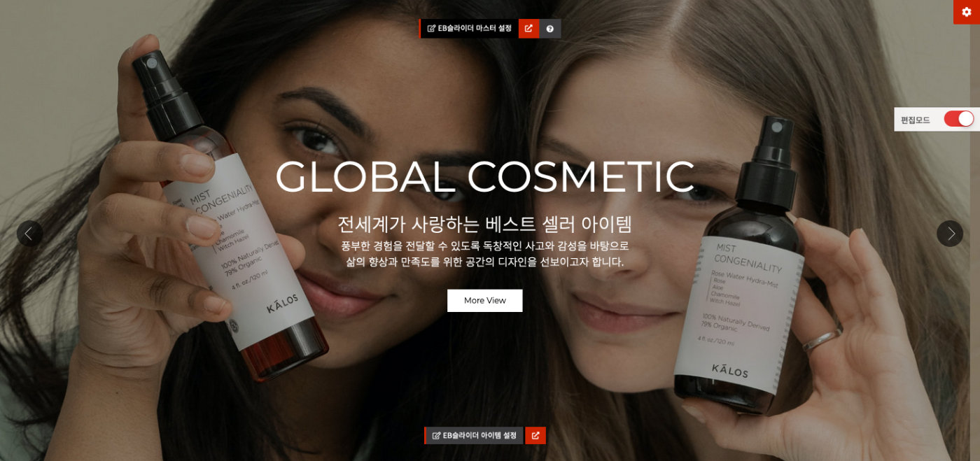 - 메인에서 편집모드를 통해 내용 및 이미지 수정이 가능하며 상품 등록 후에도 개별상품 설정이 가능합니다.
