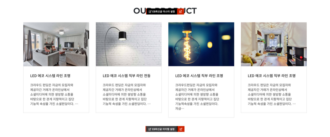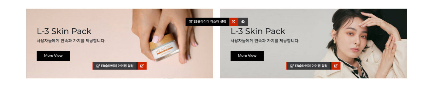 - · 푸터슬라이더(EB슬라이더) : 아이템설정 - 대표타이틀, [링크] #1 입력, 이미지 #1,2(이미지 비율 #1(pc) : 800x694 픽셀 / #2(mobile) : 800x230 이미지 사용)를 입력 및 등록