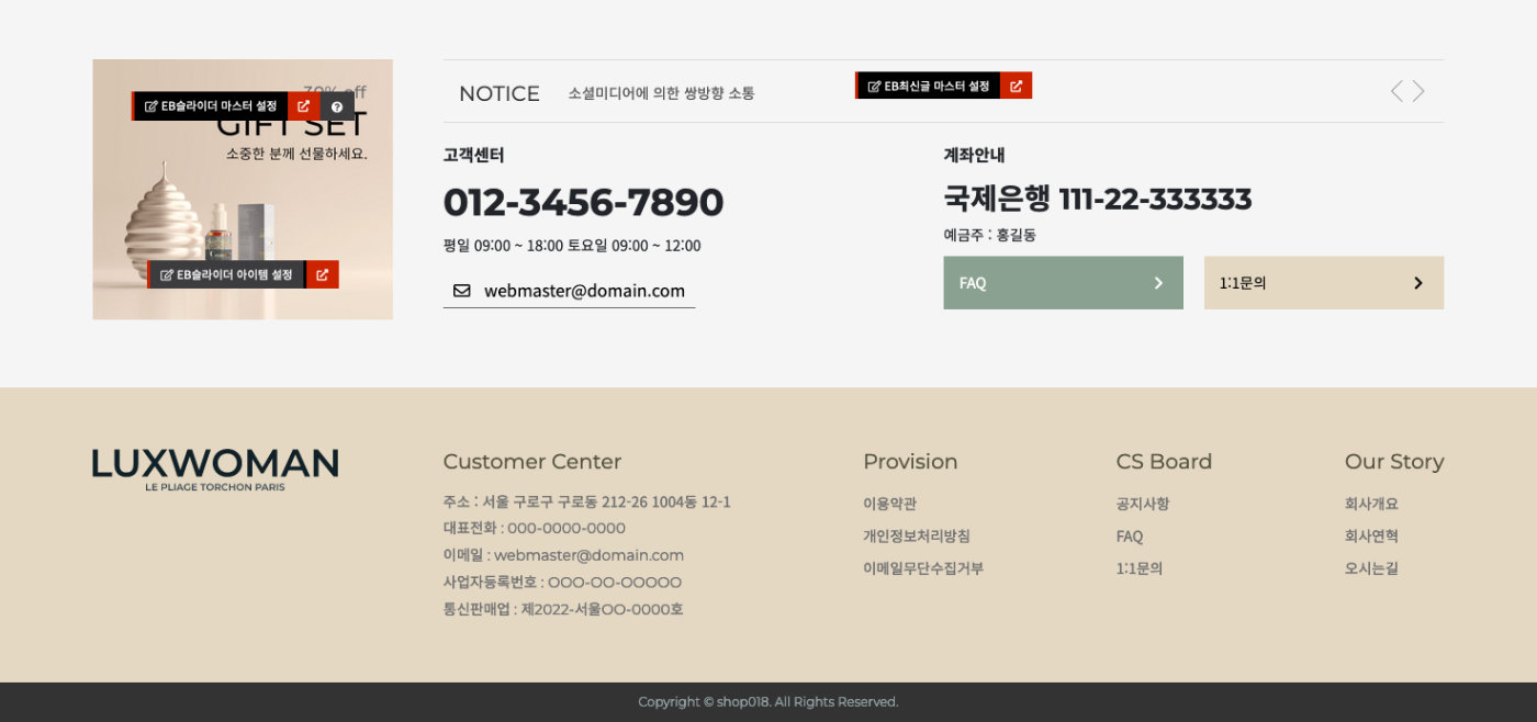 - · 푸터메뉴, 입금정보, 소셜링크, 카피라이트는 해당 파일에서 직접 수정합니다.